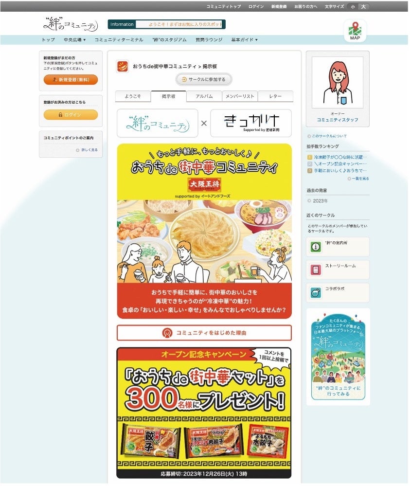 オープンを記念して、本コミュニティにご登録いただき、コミュニティ内でコメント投稿を行った方を対象に、「おうちde街中華セット」が、300名様に当たるキャンペーンを実施します。締め切りは2023年12月26日13時。コミュニティへの登録、参加は無料です。