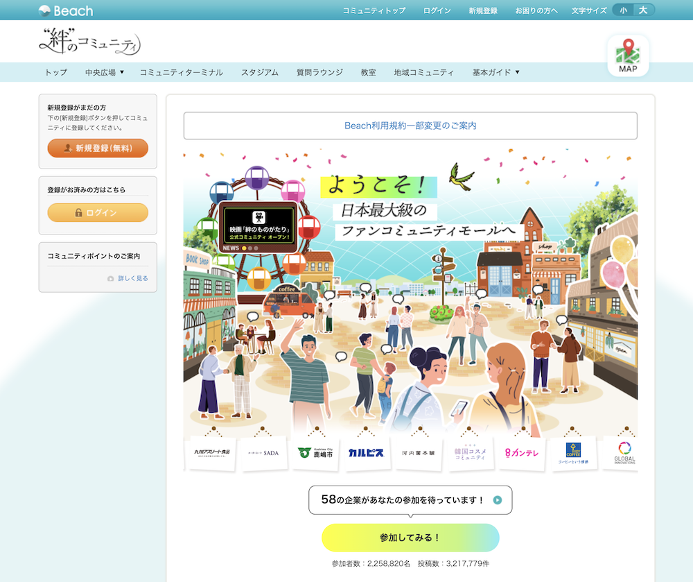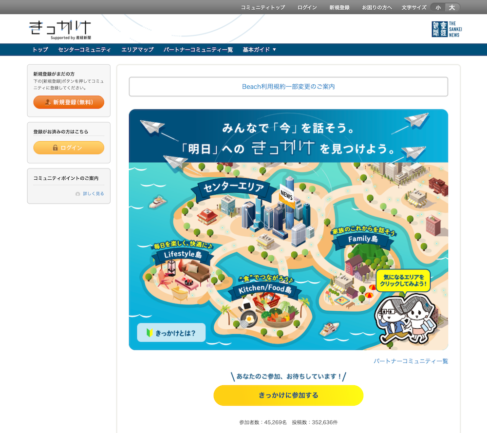 「きっかけ」(https://www.beach.jp/community/KIKKAKE/)は、産経新聞社とクオンが、共同で運営しているオンライン上のコミュニティです。ショッピングモールのようなイメージで発展していくのが特徴の1つで、「きっかけ」は、中心(センター)にある広場のような役目を果たしています。ユーザーはセンターコミュニティである「きっかけ」で、さまざまな会話やキャンペーンを楽しみながら、テナントにあたるクライアントの“パートナーコミュニティ”にも自由に参加、回遊し、コミュニケーションが活性化しています。