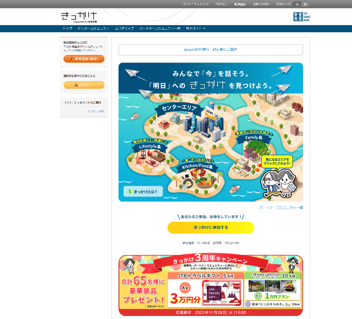 「きっかけ」( https://www.beach.jp/community/KIKKAKE/ )は、産経新聞社とクオンが、共同で運営しているオンライン上のコミュニティです。ショッピングモールのようなイメージで発展していくのが特徴のひとつで、「きっかけ」は、中心(センター)にある広場のような役目を果たしています。ユーザーはセンターコミュニティである「きっかけ」で、さまざまな会話やキャンペーンを楽しみながら、テナントにあたるクライアントの“パートナーコミュニティ“にも自由に参加、回遊し、コミュニケーションが活性化しています。