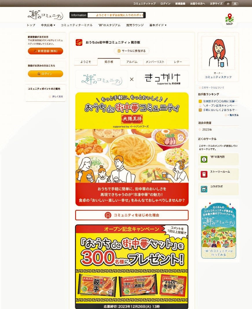 オープンを記念して、本コミュニティにご登録いただき、コミュニティ内でコメント投稿を行った方を対象に、「おうちde街中華セット」が、300名様に当たるキャンペーンを実施します。締め切りは2023年12月26日(火)13時。コミュニティへの登録、参加は無料です。