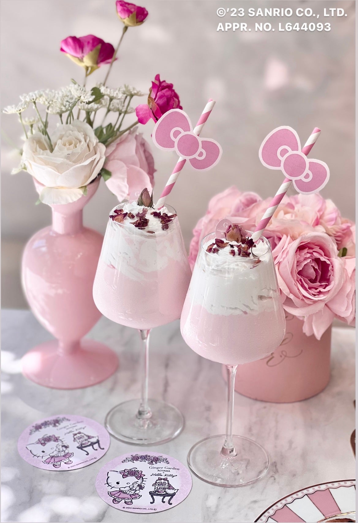 キティちゃんとテディジンジャーくんのオリジナルイラストコースター付き。濃厚ストロベリーローズミルク