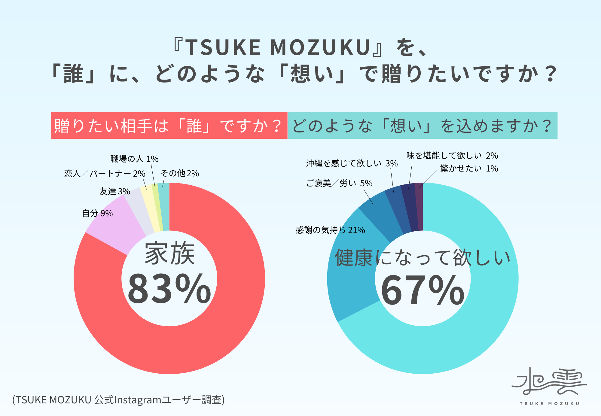 『TSUKE MOZUKU』の発売を記念し、Instagram(インスタグラム)ユーザーに対して、誰に、どのような思いで『TSUKE MOZUKU』を贈りたいかを調査したところ、贈りたい相手のNo.1は『家族』で83%、『健康(元気)になって欲しい』という気持ちで贈りたいが67%となりました。