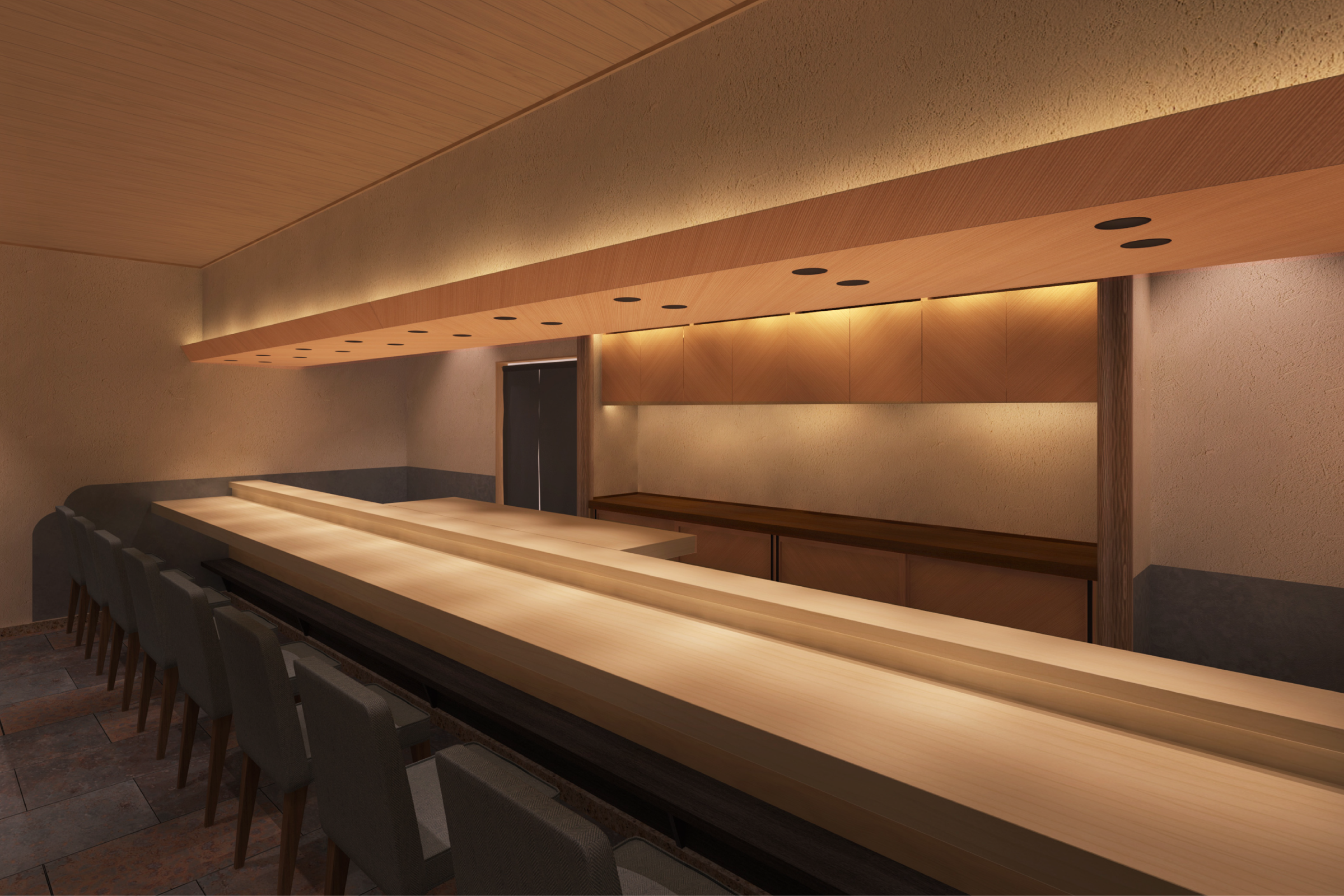 高級旅館や有名割烹等を手掛けた設計士が提案する、木や石などの自然素材を活かし、時代を超えて愛され続ける、趣と心地良さが同居する洗練された空間。
