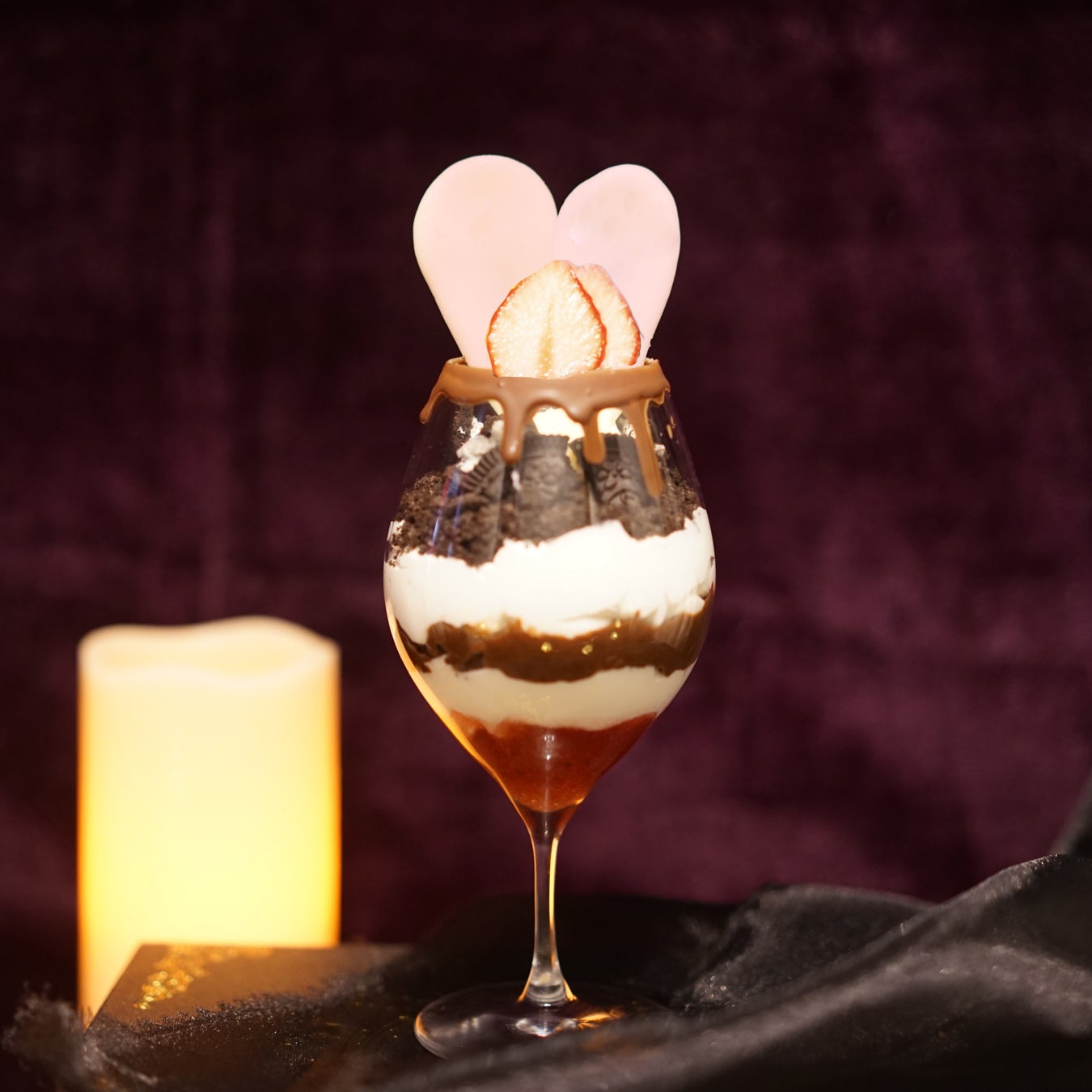 ハートの女王を表現したフォトジェニックなパルフェ。下層にはブラッドを表現したオリジナルのベリーソースチョコレートのホイップやアイスの甘さと、チョコブラウニーやオレオなどビターな味わいもあり、大人の方にもお楽しみいただけるパルフェとなっております。