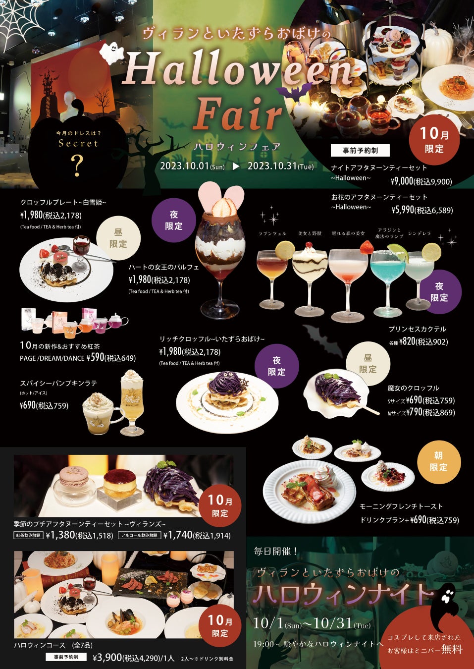 看板メニューのお花のアフタヌーンティーにはかわいらしいおばけのスイーツが新たに登場します。それ以外にもプリンセスをイメージしたオリジナルのスペシャルカクテルや、夜限定メニューにハートの女王のヴィランを表現したフォトジェニックなパフェも新登場。他にも推し活に大人気のプチアフタヌーンティーがヴィランのアフタヌーンティーとしてフェアを彩ります。名古屋店では毎日夜限定イベントとして、ハロウィンナイトを開催。遊び心に溢れ、ちょっぴりこわくて、でもかわいいお化けのスイーツとともに心躍るハロウィンをお楽しみください。