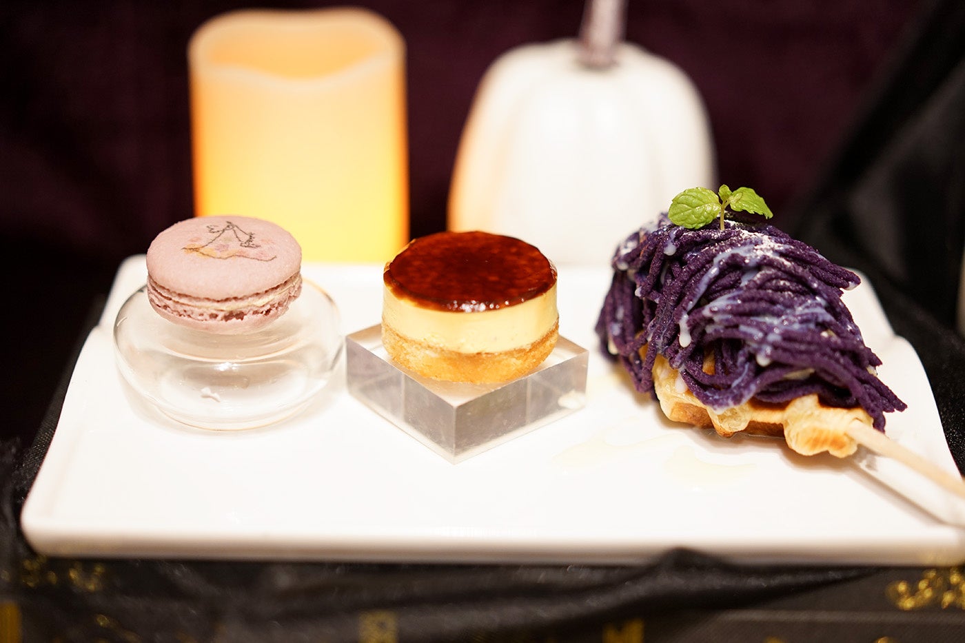 10月限定のプチアフタヌーンティーは、ヴィランをモチーフにした紫カラーの限定クロッフルをメインに、