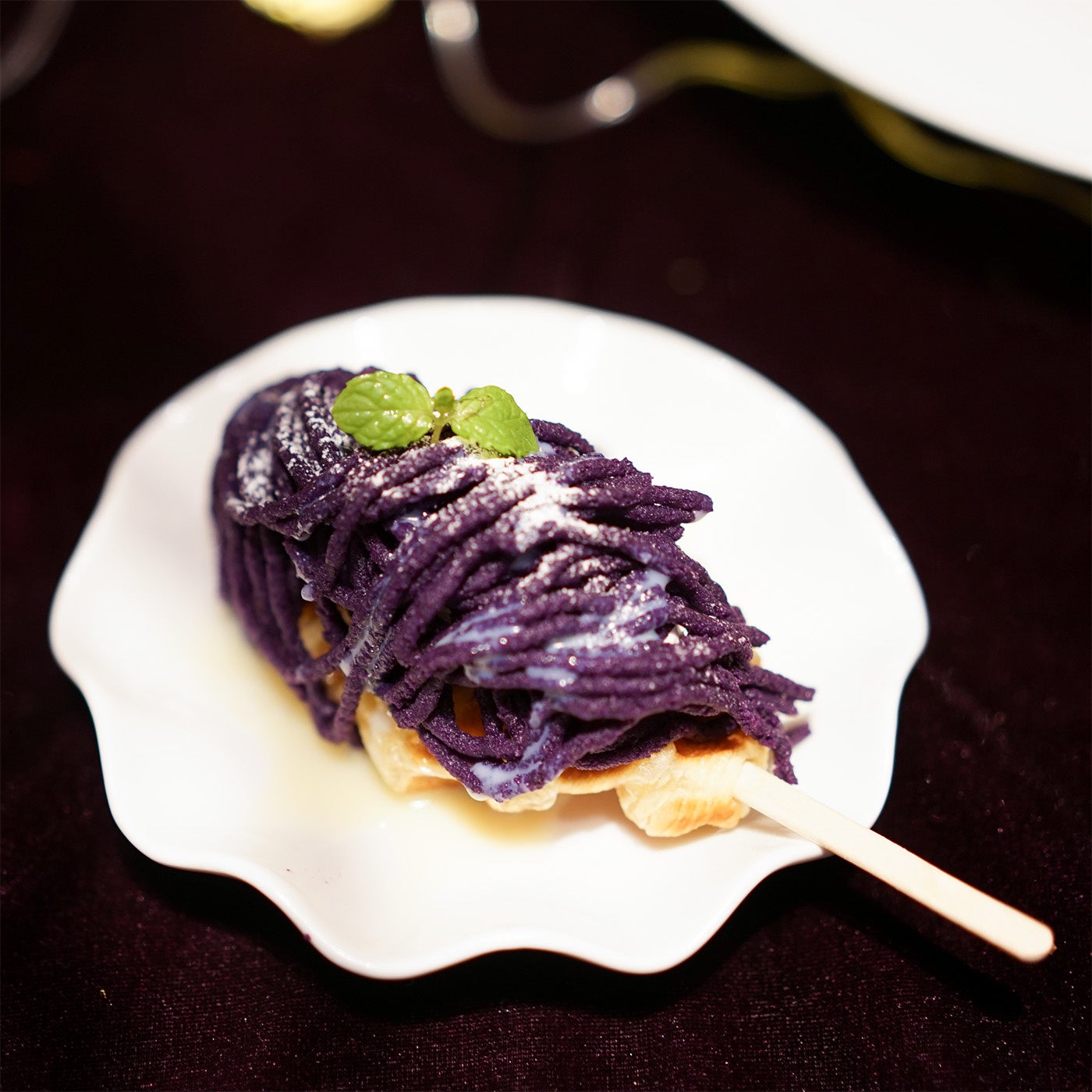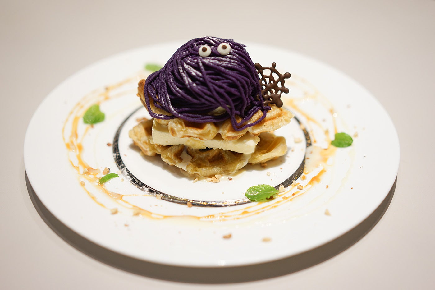 ちょっと大人のスイーツリッチクロッフルは、紅芋のモンブランでいたずらおばけを表現。見た目にも可愛らしくハロウィンらしい一品。ぜひハロウィンを楽しんで。