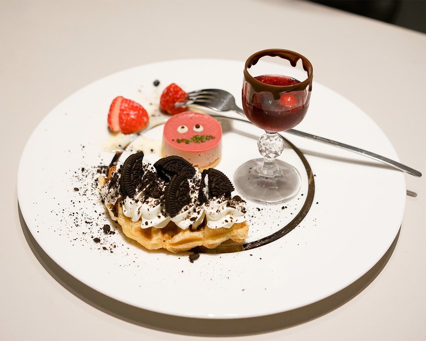 白雪姫の魔女をイメージしたクロッフルプレート。チョコレートが滴るポイズンソースをクロッフルにかけてお楽しみください。