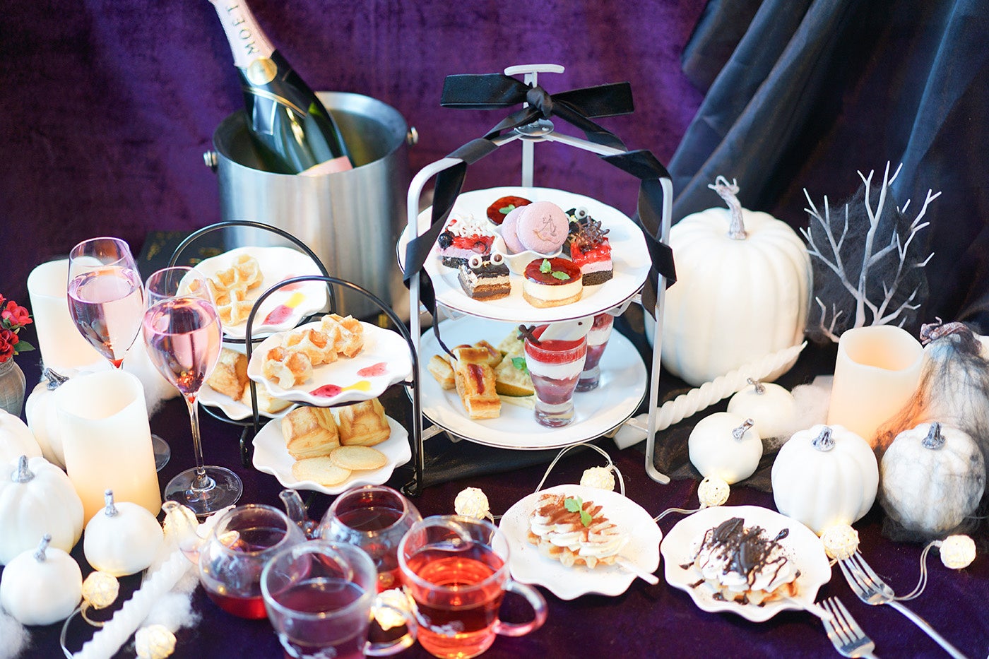 10月限定のプチアフタヌーンティーは、ヴィランをモチーフにした紫カラーの限定クロッフルをメインに、