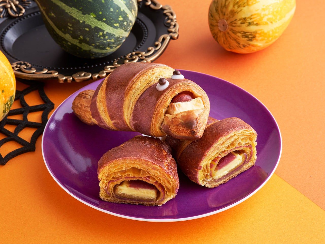安納いもの焼きいもパウダーを使ったサンマルクカフェ史上初となるバイカラーのクロワッサン生地と安納いもを練り込んだチョコレート、そしてその上に絞られる紅いも餡から構成される、可愛らしいおばけのような『プレミアムチョコクロ いたずらおばけのWスイートポテト』が登場します。
