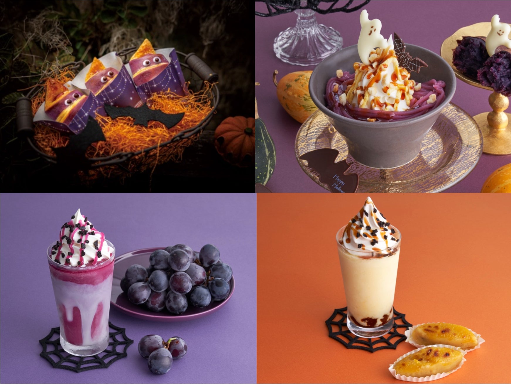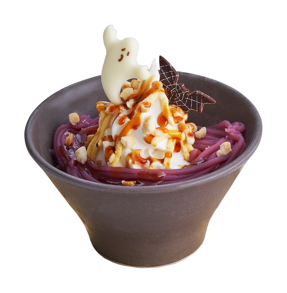 ドリンクは、紫の魔女をイメージし、芳醇な巨峰を使用した『Happy Halloween魔女の巨峰スムージー』と、ハロウィンを象徴するジャックオーランタンをイメージし、さつまいもをふんだんに使用した、『Happy Halloween スイートポテトスムージー』が登場。さらに、おばけたちのハロウィンパーティーを紅いもとかぼちゃで表現した、『紅いも&かぼちゃのHappy Halloweenパフェ』が登場します。