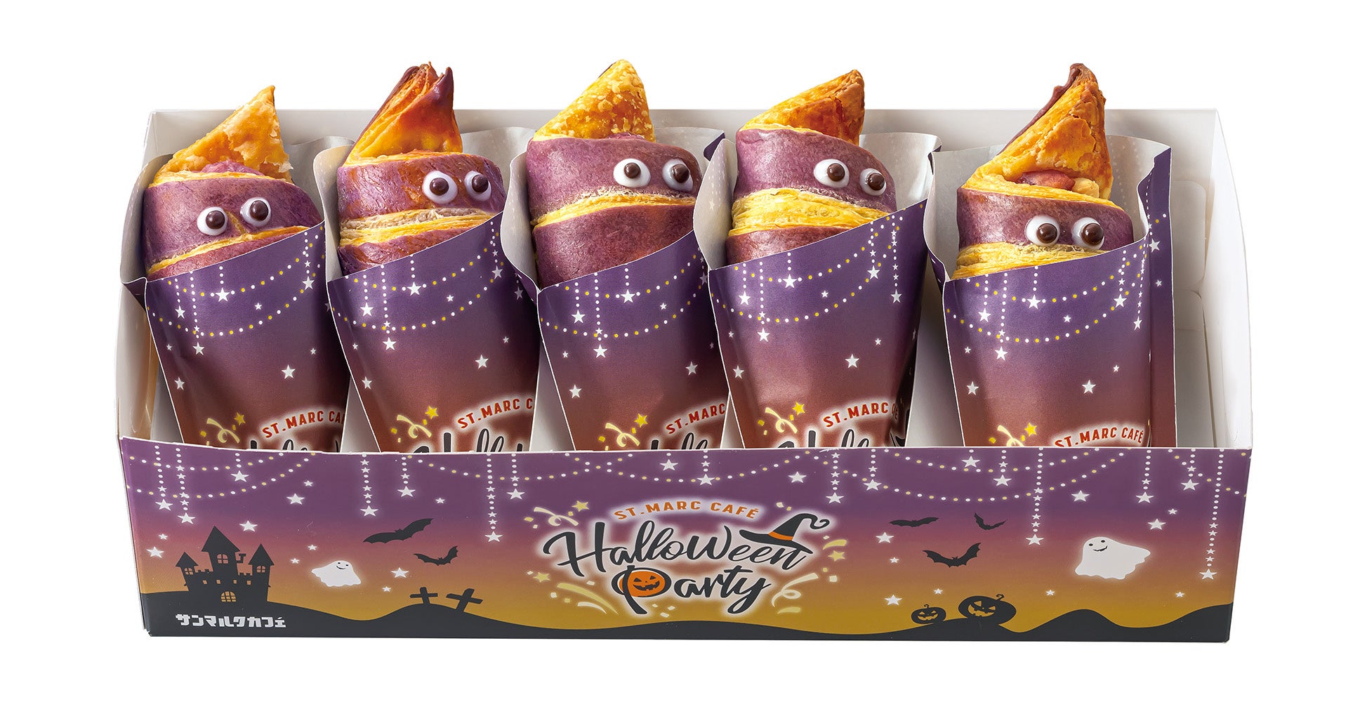 安納いもの焼きいもパウダーを使ったサンマルクカフェ史上初となるバイカラーのクロワッサン生地と安納いもを練り込んだチョコレート、そしてその上に絞られる紅いも餡から構成される、可愛らしいおばけのような『プレミアムチョコクロ いたずらおばけのWスイートポテト』が登場します。