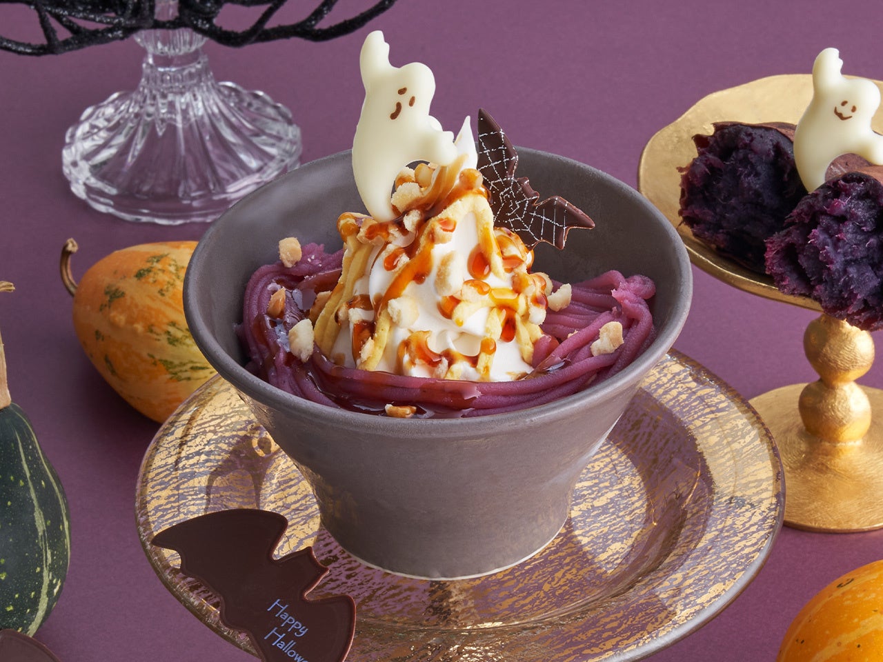 ドリンクは、紫の魔女をイメージし、芳醇な巨峰を使用した『Happy Halloween魔女の巨峰スムージー』と、ハロウィンを象徴するジャックオーランタンをイメージし、さつまいもをふんだんに使用した、『Happy Halloween スイートポテトスムージー』が登場。さらに、おばけたちのハロウィンパーティーを紅いもとかぼちゃで表現した、『紅いも&かぼちゃのHappy Halloweenパフェ』が登場します。