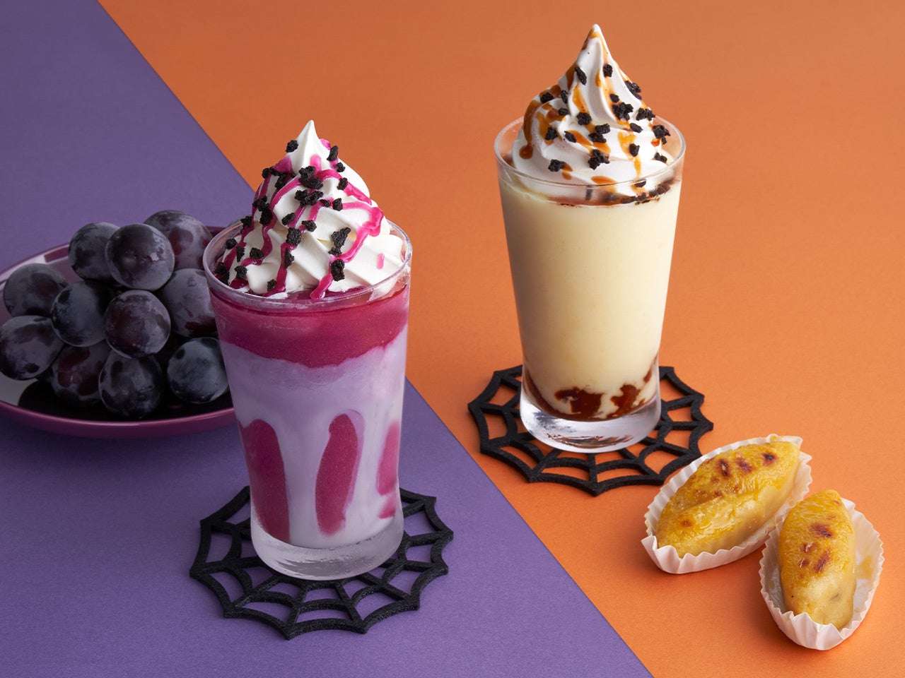 『Happy Halloween魔女の巨峰スムージー』と『Happy Halloweenスイートポテトスムージー』は、ソフトクリームなしをお選びすることができますので、その日の気分にあわせてお楽しみください。