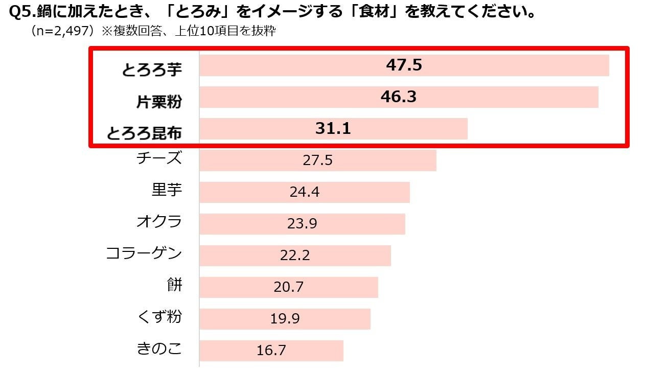 ・鍋に加えた時に「とろみ」をイメージする食材は「とろろ芋」「片栗粉」「とろろ昆布」がTOP3。