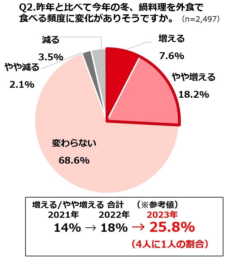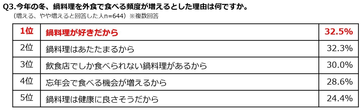 ・鍋料理を外食で食べる頻度は4人に1人が「増える」と回答。理由は「鍋料理が好きだから」が最多。