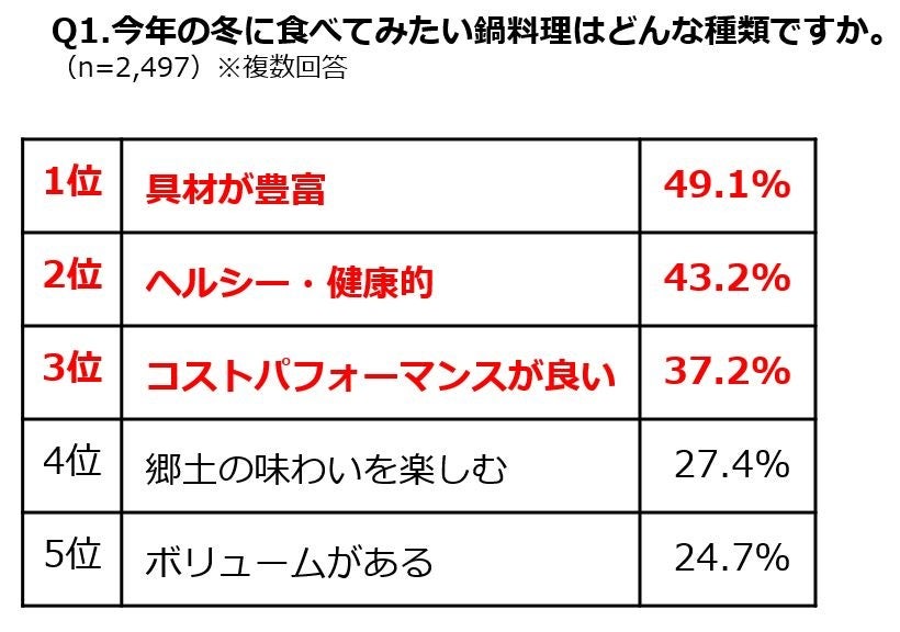・食べてみたい鍋料理の種類は「具材が豊富」「ヘルシー・健康的」「コスパが良い」がTOP3。