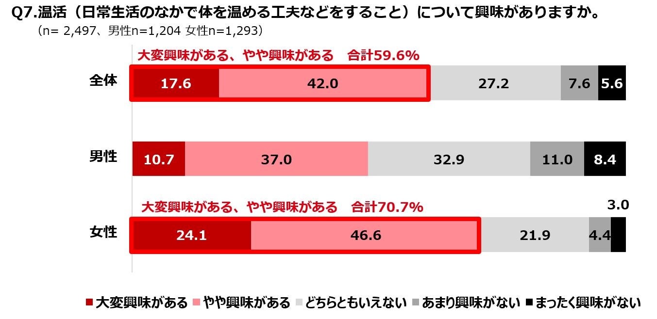・温活(生活のなかで体を温める工夫などをすること)に興味がある人は6割、女性は7割と高めの傾向。