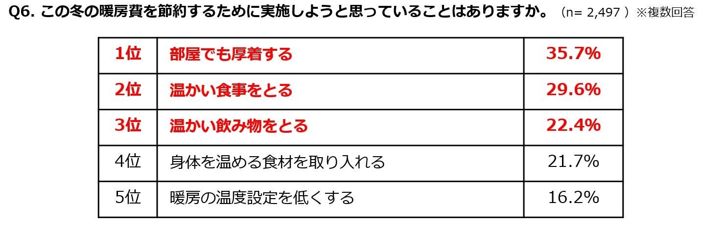 ・冬の暖房費の節約対策は「部屋でも厚着」「温かい食事をとる」「温かい飲み物をとる」がTOP3。