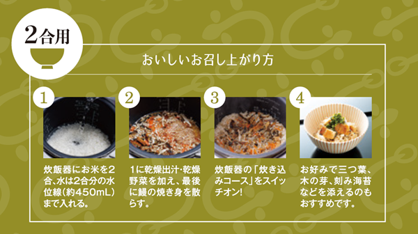 初めて常圧凍結乾燥技術を体験したとき、まず印象に残ったのは香りでした。この技術があれば、出汁の香りをそのままお届けできると確信し、炊き込みご飯を考案しました。うなぎと出汁、そして野菜の香りまで炊飯器の中で上手に混ざり合うと思います。お楽しみいただけたら幸いです。