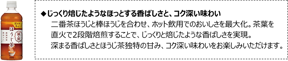 「葉の茶 ほうじ茶 ホット&コールド」は、直火でじっくり2段階焙煎した、二番茶ほうじと棒ほうじを合わせることで、口に含んだ瞬間から香るじっくり焙じたような香ばしさを実現。深まる香ばしさとほうじ茶独特の甘み、コク深い味わいをホットでお楽しみいただけます。
