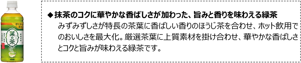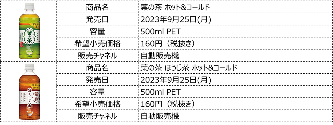 「葉の茶 ホット&コールド」は、みずみずしさが特長の茶葉に香ばしい香りのほうじ茶を合わせた、ホット飲用シーンでのおいしさを最大化するこだわりの緑茶です。二種の茶葉それぞれを低温・高温の二つの温度帯で抽出し、コクを感じる抹茶と香ばしい香りの抹茶を組み合わせることで、華やかな香ばしさ、コクと旨味を感じられる味わいに仕立てました。