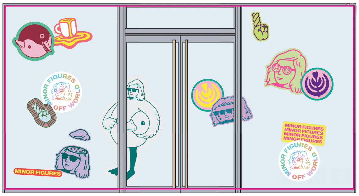 「OFF WORLD」の開催を記念し、期間限定でマイナー・フィギュアズのイラストのグラフィックで広尾カフェの外観をラッピング!ブランドの世界観が伝わるユニークなデザインをお楽しみに。