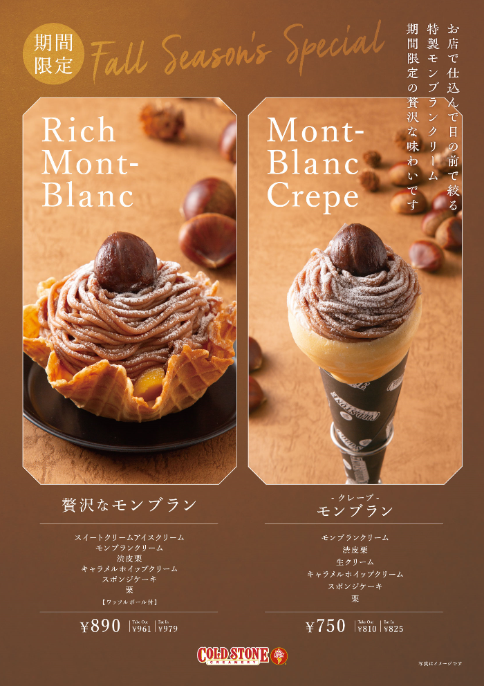 今回は、秋の人気スイーツ “モンブラン” の本来の美味しさを味わえる商品『贅沢なモンブラン』は、北海道産の生クリームを使用した濃厚な味わいのスイートクリームアイスクリームに、手切りの栗とキャラメルホイップクリーム、スポンジケーキを組み合わせ、店内仕込みでお客様の目の前で絞るモンブランクリームは、天然のマダカスカル産バニラを加えた濃厚なヨーロッパ産マロンペーストを使用。最後に大粒の“渋皮栗をまるごと1粒“トッピングした期間限定の贅沢な味わいです。