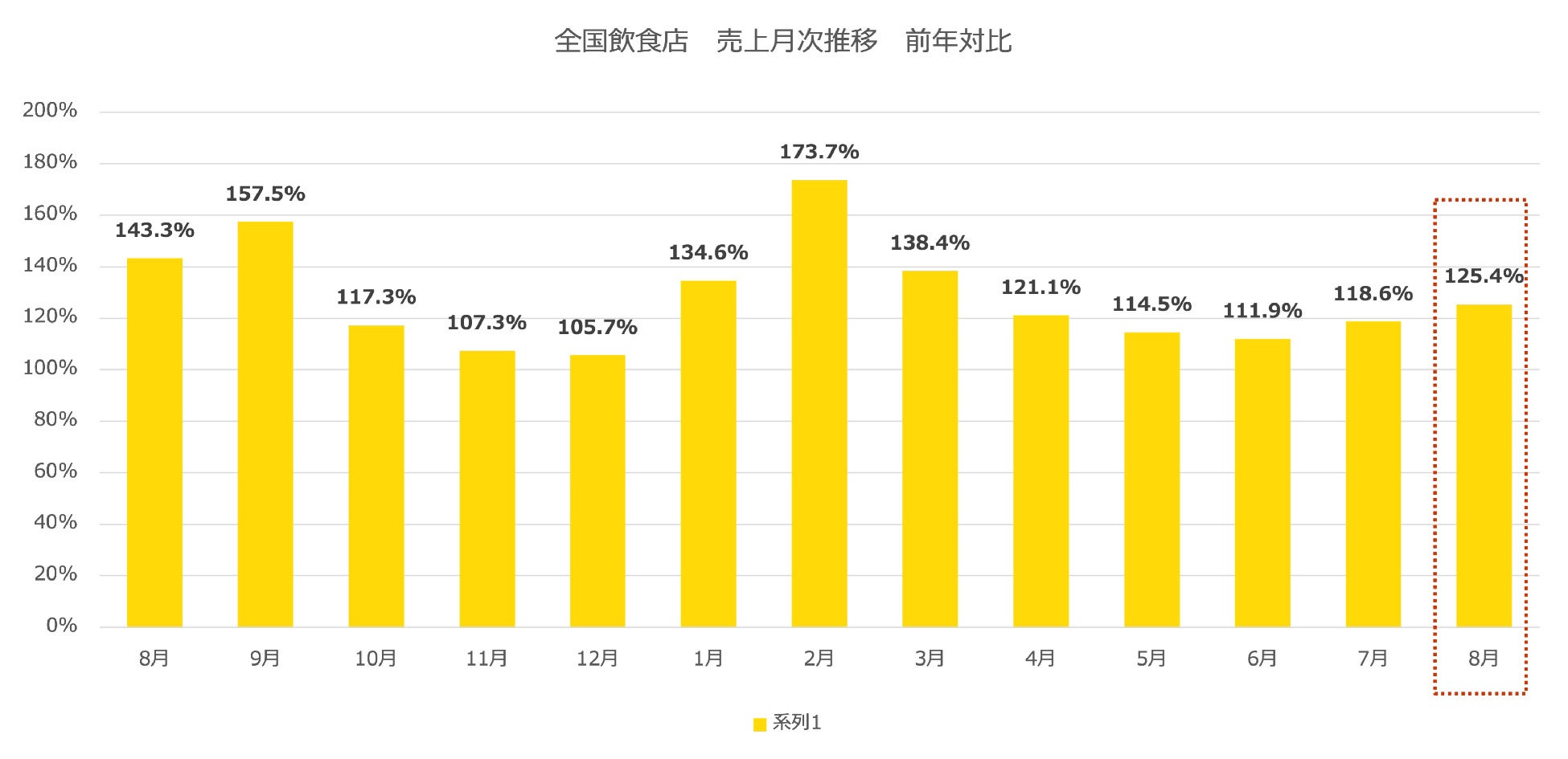 8月度の前年対比の売り上げ伸長率は、前月から6.8pt増加し前年対比125.4%で、引き続き上昇となった。