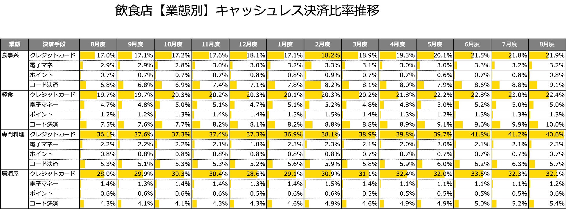 業態別のキャッシュレス比率は、持ち帰り以外の業態で35%以上を突破。軽食、持ち帰りでのコード決済比率の割合が10%を超える。