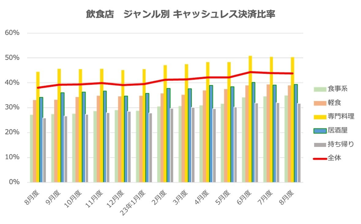 業態別で見ると、キャッシュレス決済利用は、1位の専門料理が53.9%と先月より0.2pt減少した。