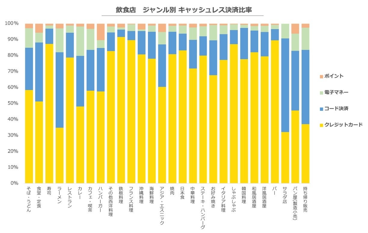 ジャンル別に見ると、キャッシュレス比率が最高水準のフランス料理と鉄板料理ではともにその比率が65%を超える。サラダ店のコード決済比率は28.1%で他業種よりも比率が高い。