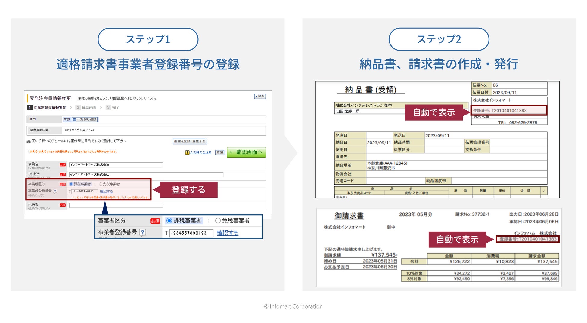 発行するインボイス(納品書または請求書)に、事前に登録した事業者登録番号を自動反映