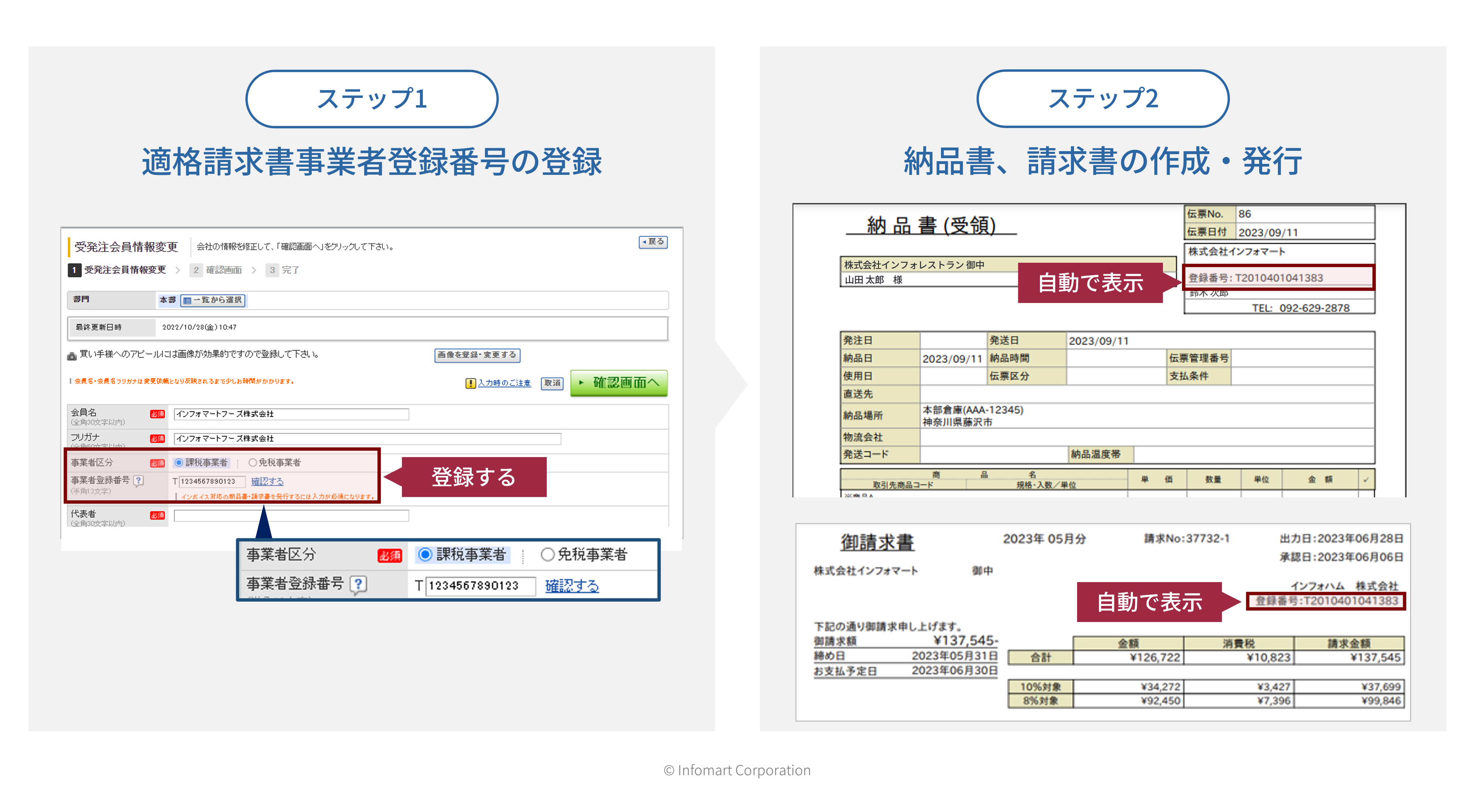 発行するインボイス(納品書または請求書)に、事前に登録した事業者登録番号を自動反映