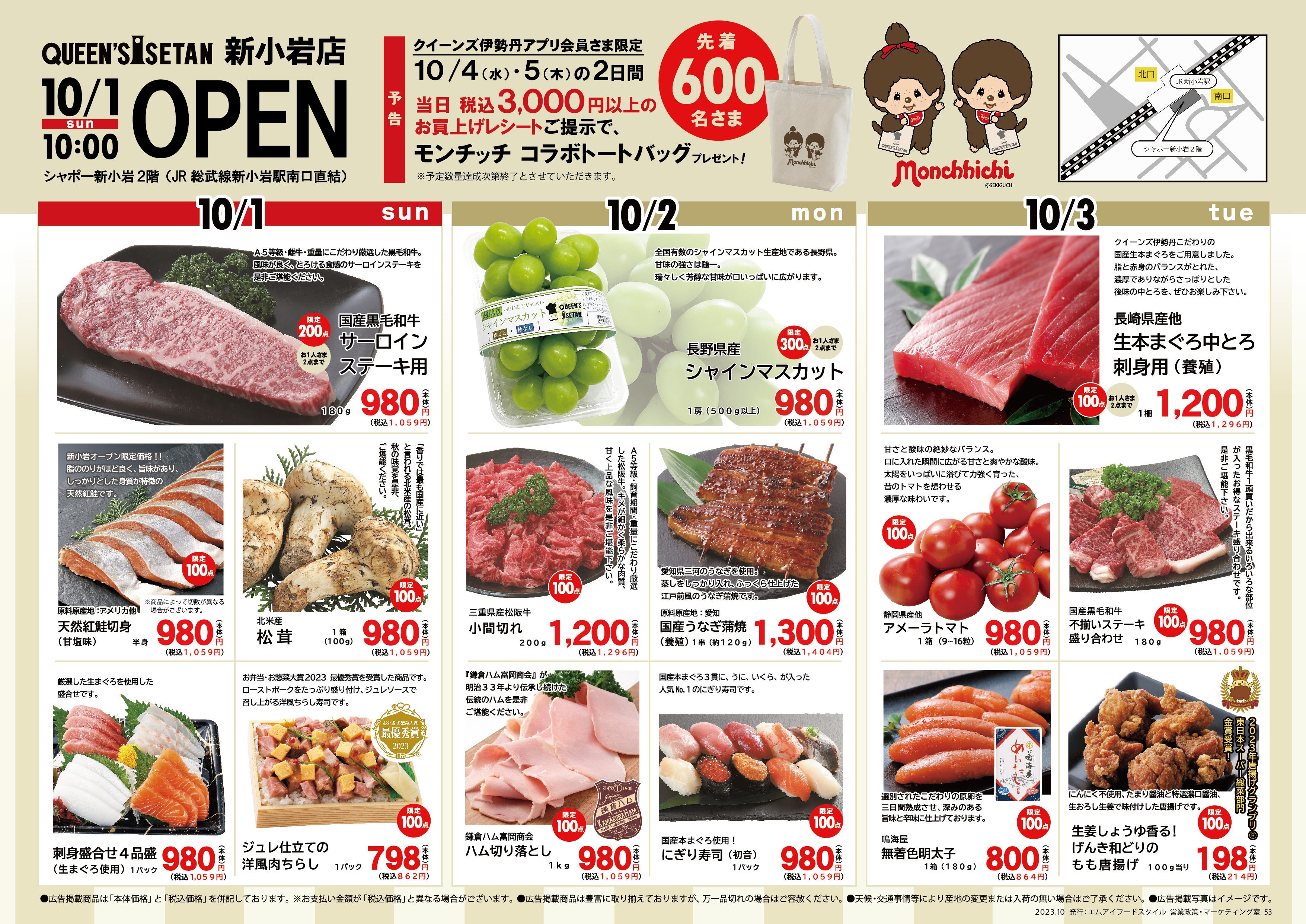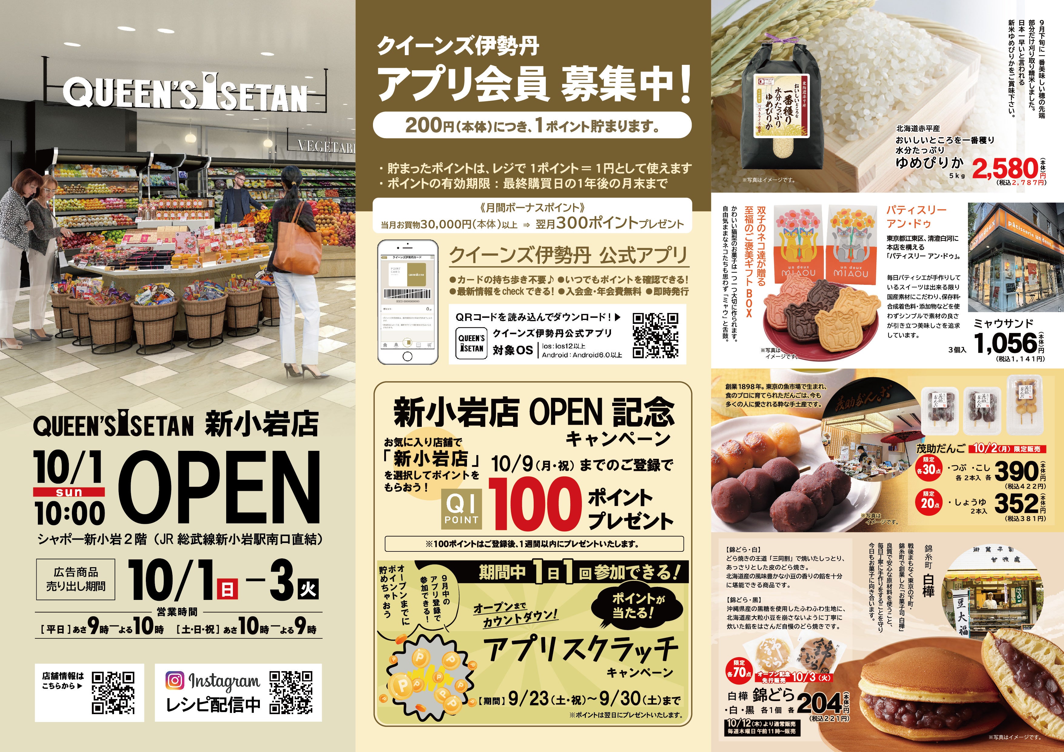 新小岩店オープン記念キャンペーンとして、クイーンズ伊勢丹公式アプリをダウンロードし、お気に入り店舗を「新小岩店」を選択すると、クイーンズ伊勢丹でのお買い物で使えるクイーンズ伊勢丹ポイント100ポイントプレゼント!10月9日までのご登録いただいた方対象となります。ぜひ、この機会にアプリダウンロード!