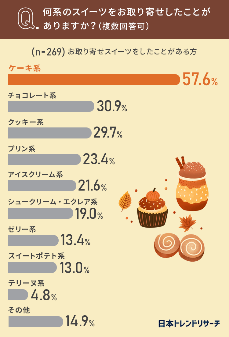 57.6%と、半数以上の方が「ケーキ系」のスイーツをお取り寄せしたと回答しています。
