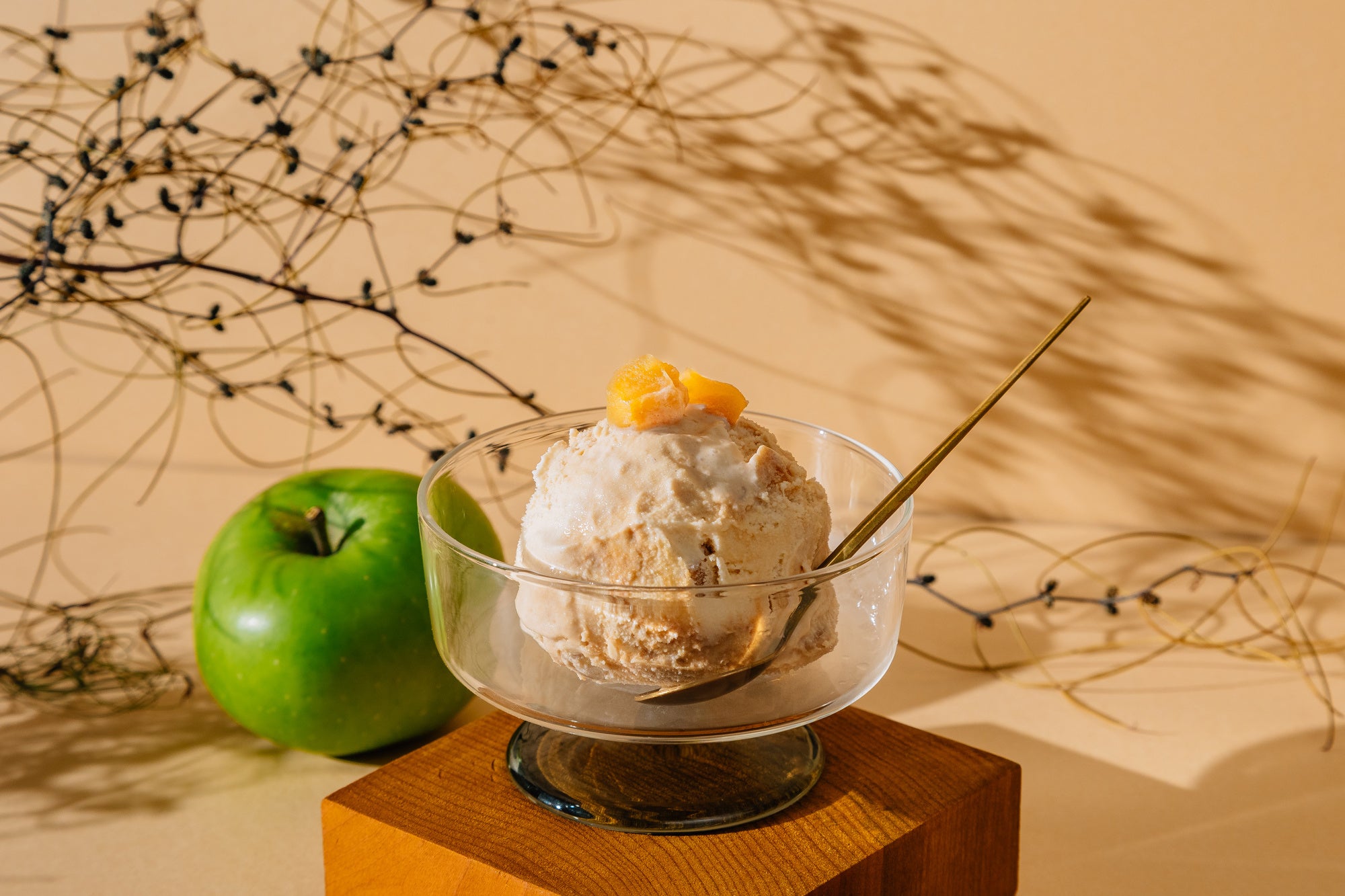 火を通した時の酸味とコクが素晴らしく、本場イギリスでは「クッキングアップルの王様」と呼ばれ人気のあるブラムリーアップル。長野県の小布施屋さんより、特別に果実と無添加のピューレを分けて頂き、シナモン香るアップルアイスをつくりました。ピューレを加えたミルクアイスに、たっぷりのバターとシナモンを使って火を通しカルバドスで香りづけした果肉を。そこで出たソースを使って特製キャラメルソースを作っています。ブラムリーならではの力強い酸味、シナモンの香りが相まって、何とも秋らしい風味に仕上がっています。