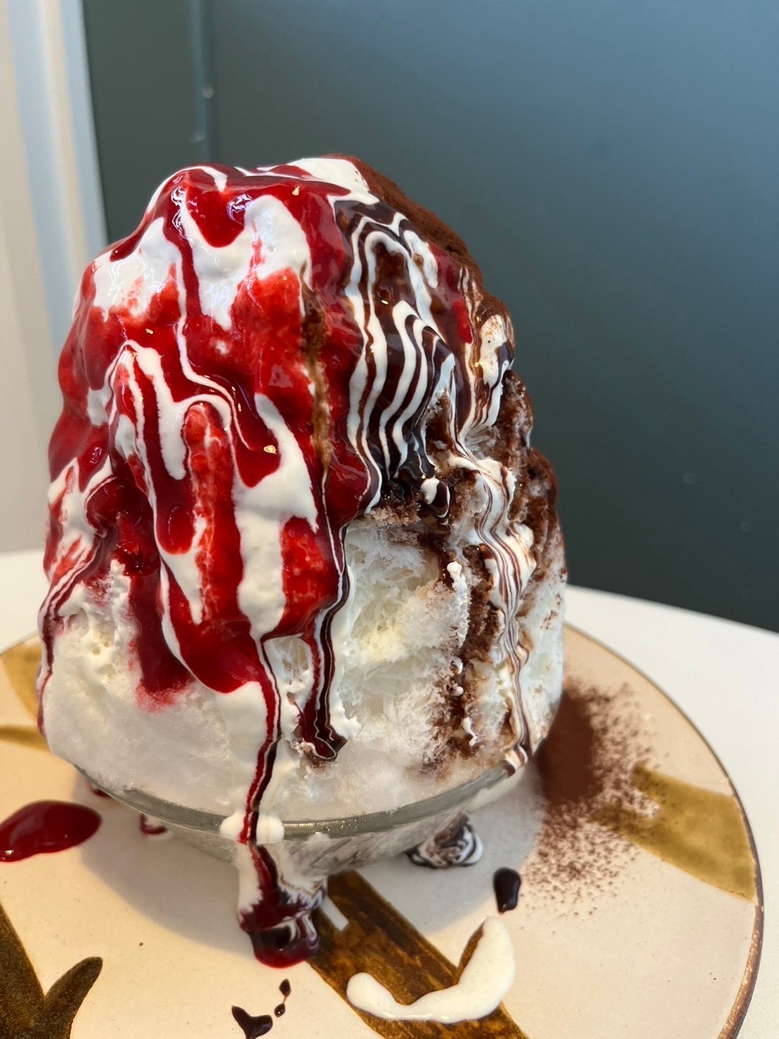 カカオ本来の豊かな風味が魅力の純ココアを贅沢にふりかけたティラミス風のかき氷に木苺ピューレを合わせ、甘酸っぱさとビターな苦みがマッチする上品な味わい。