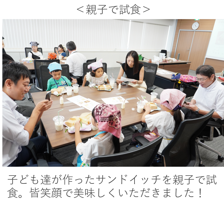 参加した子ども達からは、「お父さんの働いている会社のことを詳しく知れてよかった」「また会社に来てみたい」「自分で作ったサンドイッチが美味しかった」と嬉しい感想が寄せられました。子どもが参加した従業員からも、「会社や職場、飼料について子どもたちが理解する良い機会となった」と好評でした。