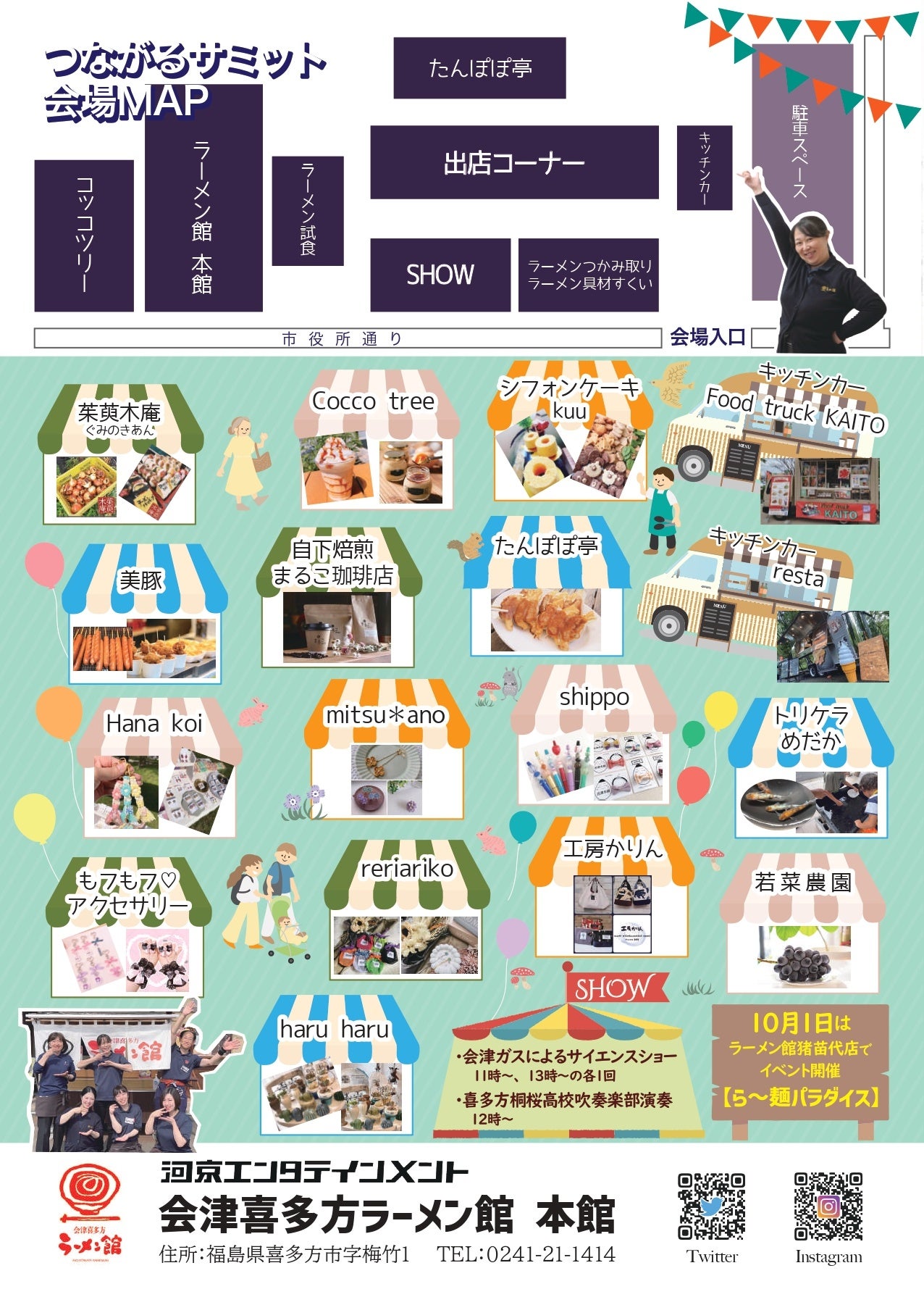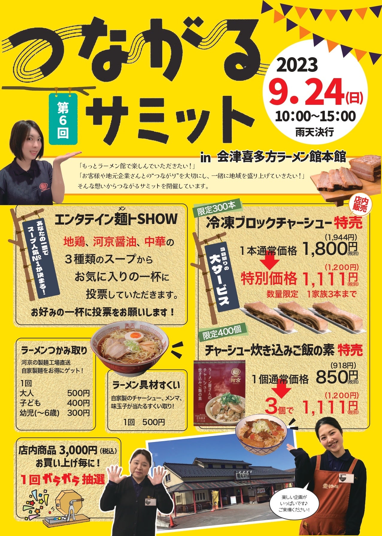 株式会社河京エンタテインメント 会津喜多方ラーメン館本館(本社:福島県喜多方市、取締役社長:土屋充孝)は、ラーメンの試食投票、ブロックチャーシューの特売と河京工場直送のラーメンつかみどり、地元のお店の人気フード販売なども行う「第5回つながるサミット」を2023年9月24日(日)に開催致します。