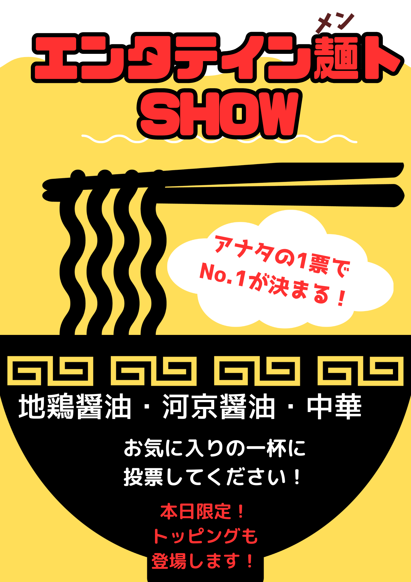 ラーメン館名物の試食がスペシャルバージョンに!普段とは違った3種類の醤油ラーメンの試食が登場します!さらに当日は様々なトッピングも出来る、まさに試食のエンタテインメントショー!