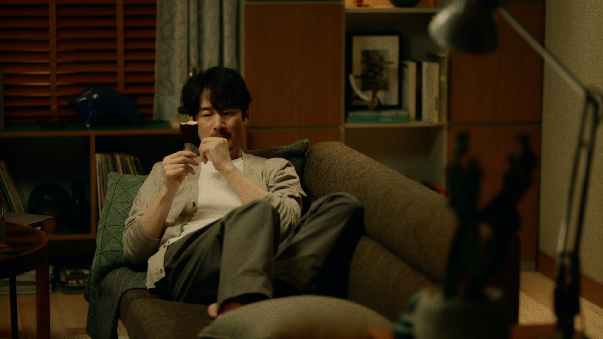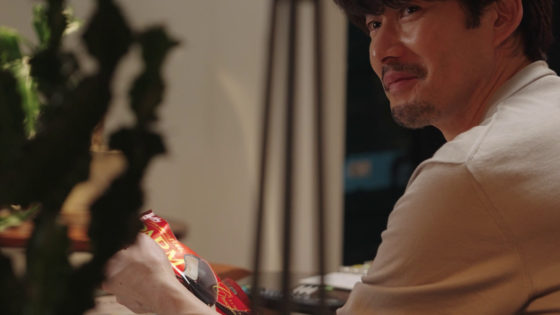 「PARM(パルム)」を片手にリビングに戻った竹野内部長はテレビをつけながらソファに飛び乗り、万全のくつろぎ態勢でパッケージを開封。一口食べるとやっぱりこの味だと言わんばかりに味わい、つい「うまい」と一言。