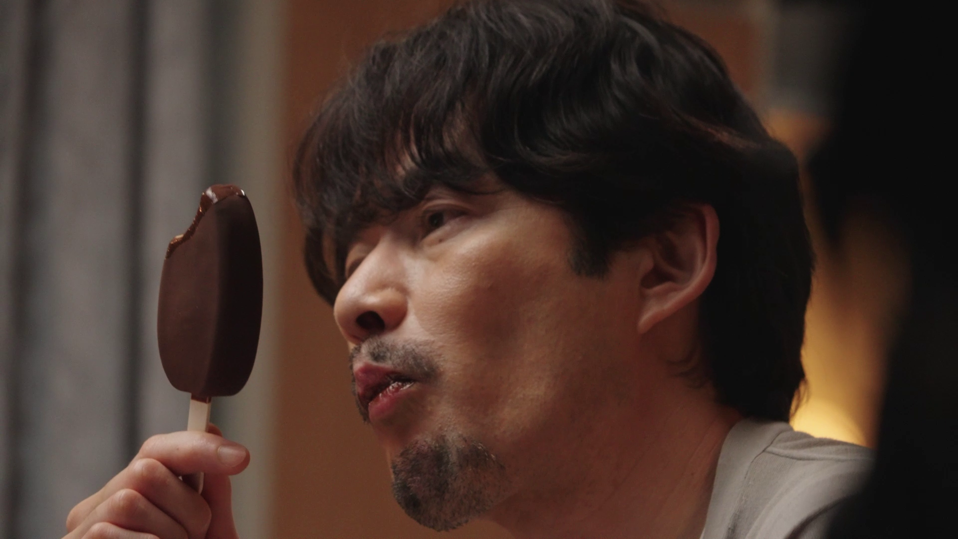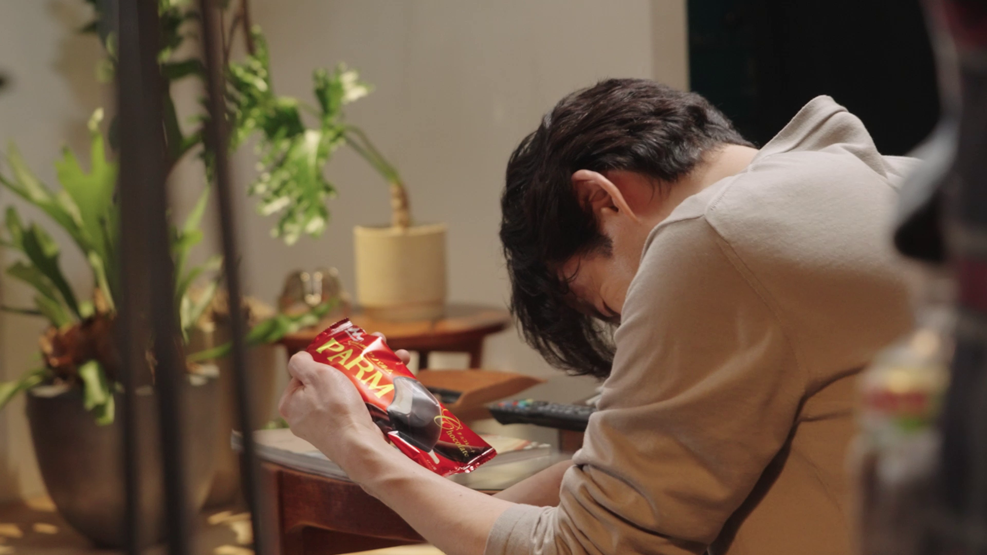 ソファに座り「PARM(パルム)」を食べだすと、仕事の電話に脇目を振らず、一心不乱に頬張り続ける。