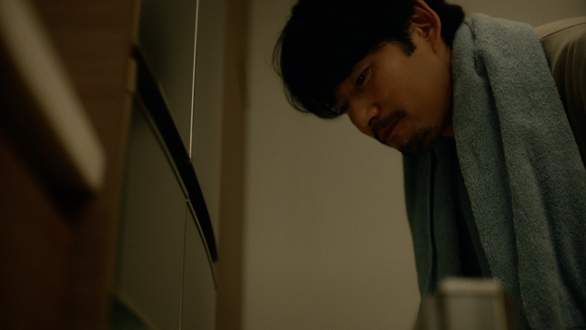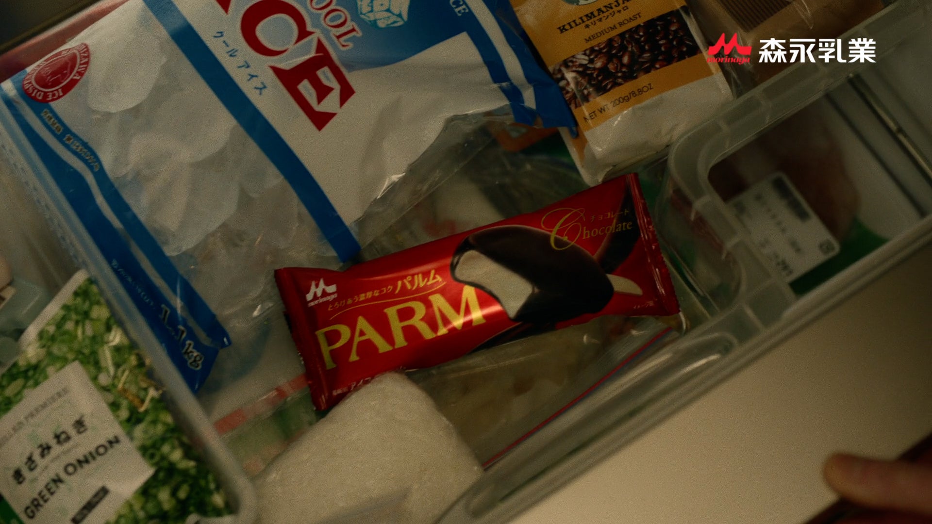 仕事を終えて帰宅し、シリーズ初の肩にタオルを掛けたお風呂上がり姿で登場した竹野内部長は、待ちに待ったと言わんばかりに心躍らせながら冷凍庫から「PARM(パルム)」を取り出します。