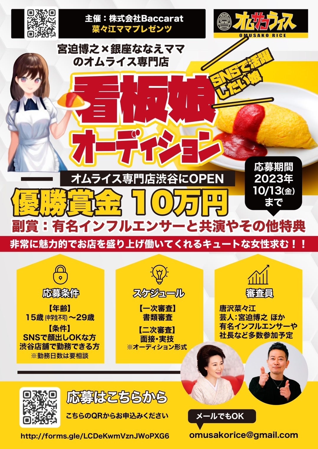 店舗を運営する株式会社Baccarat(本社:東京都中央区銀座 グループ代表 平出孝一)は、「オムサコライス渋谷本店」を共に盛り上げてくれる看板娘を募集!「オムサコライス看板娘選考オーディション」を開催いたします。