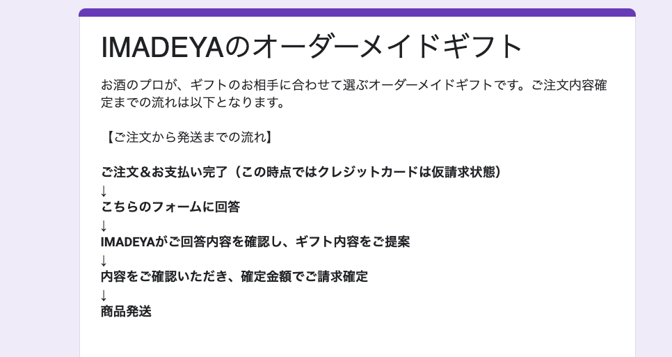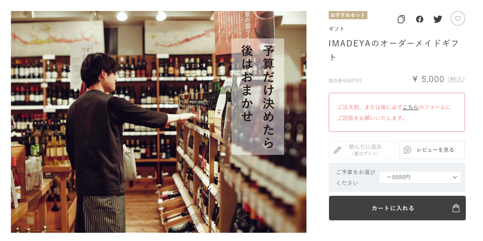 IMADEYAでは日頃より「お酒をプレゼントしたいけど、何を選んだらいいのかわからない」と言った声を店頭で多くいただきます。このサービスはそういったお悩みをオンラインショップでも受け付け、ご予算に応じてお酒のプロがご提案、発送までをワンストップで行うサービスです。eギフトの浸透により市場全体が伸びているギフト市場ですが、これまでオンラインでお酒を購入するには一定の専門知識が必要でした。このサービスを使えば、お酒に詳しくない方でも、オンラインでお酒を贈りやすくなります。