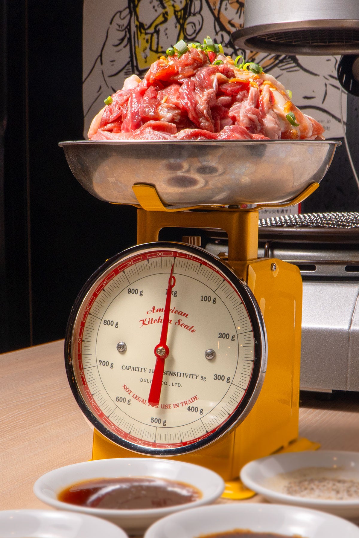 豚・鶏のカルビ肉を計りにのせて提供する「1kgカルビ」と「1kgカレー」を提供する『完璧で究極の1kgゲッターカ