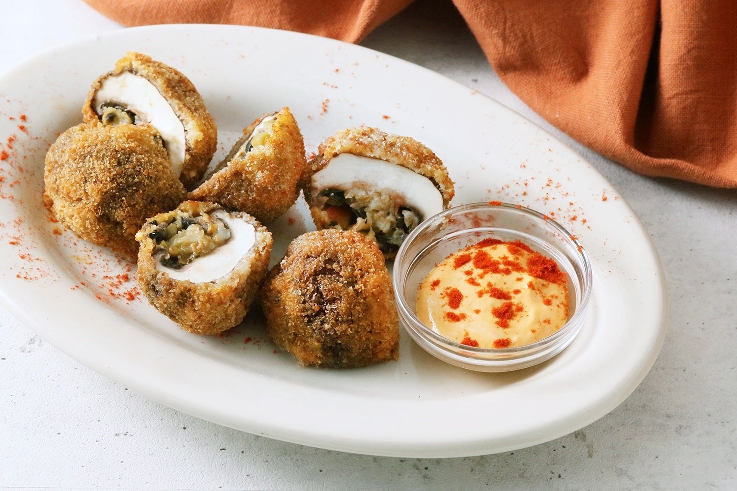●貝類のデュクセルを詰めた舟形マッシュルームのフリット チリマヨネーズ添え 1190円(税込)
