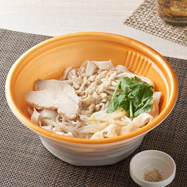 【特長】タイの屋台でもよく食べられている、あっさりとした味わいの「センレックナーム」をイメージし、もちもちした食感とつるりとしたのど越しの自家製の米粉麺に、ナンプラーを加えた鶏がらベースのスープを合わせた本格的な味わいです。蒸し鶏、鶏そぼろ、パクチー、もやしをトッピングしました。別添の胡椒で味の変化も楽しめます。