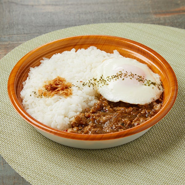 【特長】ごはんに、鶏挽き肉とホーリーバジルとオイスターソースで炒めたガパオ炒めと目玉焼き、フライドオニオンを盛りつけました。ホーリーバジルのさわやかな香りとピリッとした辛さがマッチした一品です。